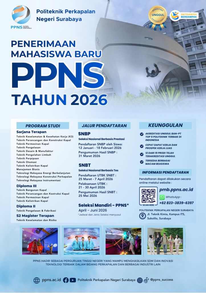 Pada Tahun Akademik 2026/2027, PPNS membuka proses seleksi Penerimaan Mahasiswa Baru dengan jalur :Ø Jalur Seleksi Nasional Berdasarkan Prestasi (SNBP)